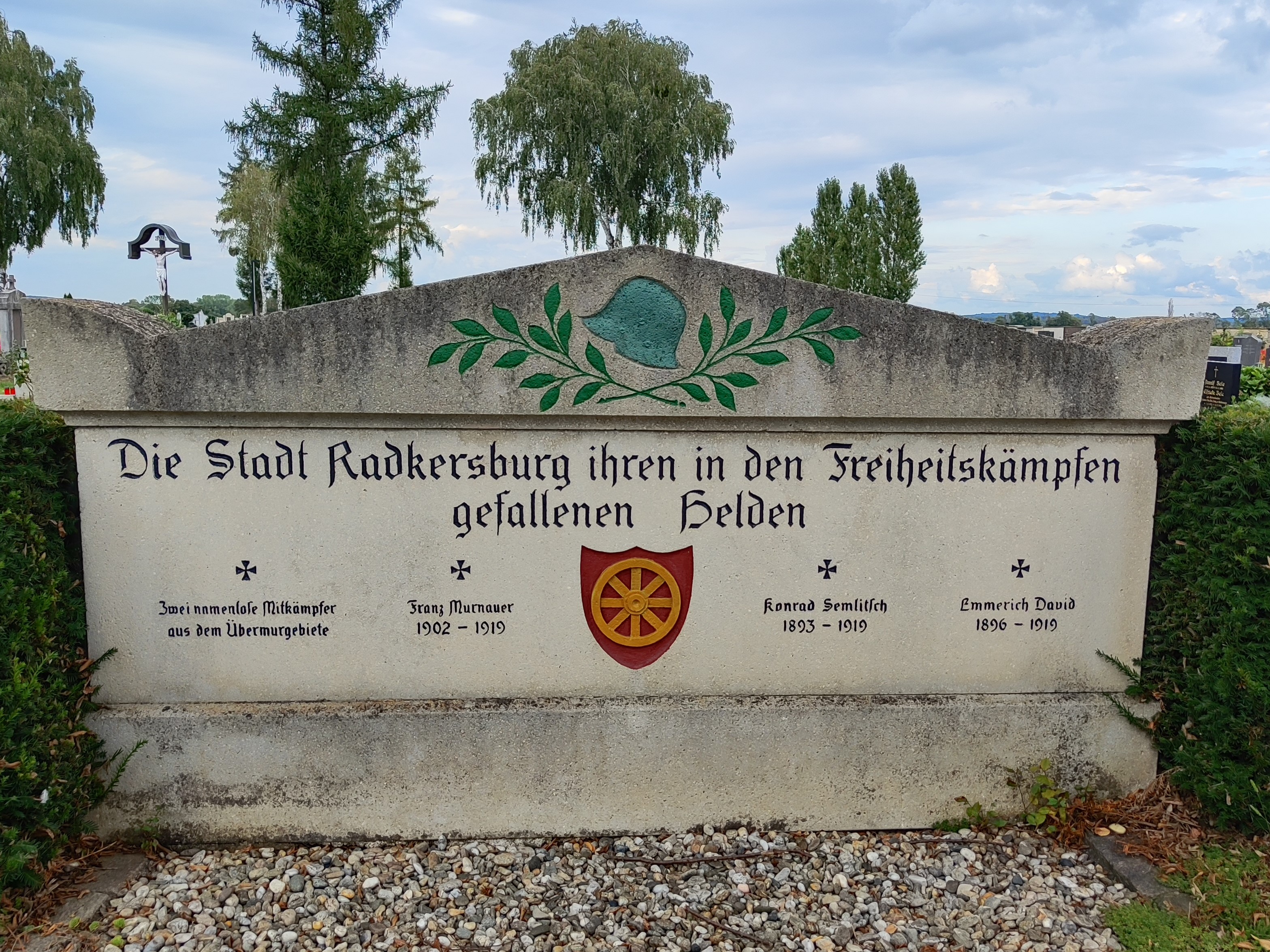 Inmitten von Feldern liegt – als Teil des Bad Radkersburger katholischen Friedhofs am Goritzer Weg – der 1929 neu gestaltete „Heldenfriedhof“ für Gefallene des Ersten Weltkriegs und des „Freiheitskampfes“ 1919.