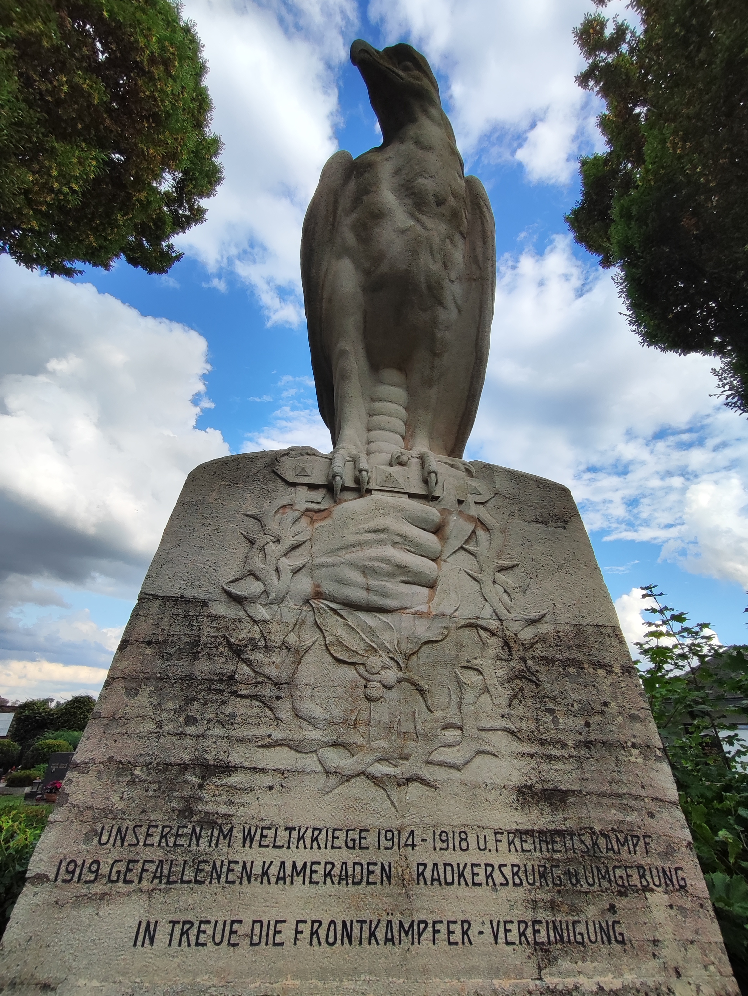 Was nun diesen tatsächlich sehr monumentalen Adler betrifft, der von Marta Peter-Reininghaus entworfen und vom Bildhauer Franz Eisner ausgeführt wurde[2], so gibt es zu dessen Bedeutung mehrere Interpretationen. Meint man auf der Website der Stadt Bad Radkersburg, dass dieser „symbolisch die Opfer des Krieges“ beschirmen würde[3], so liest sich die zeitgenössische Deutung doch um einiges deutschnationaler: „Der mächtige Adler des Frontkämpferdenkmals ruht auf einer Pyramide, seine Schwingen sind gefaltet, ein Dornenkranz umschließt eine feste Soldatenfaust. Der Adler verweist symbolisch darauf, dass der Tag kommen wird, an welchem der Aar seine Schwingen zum Höhenflüge ausbreitet und der Dornenkranz des deutschen Leides fallen wird.“[4]
