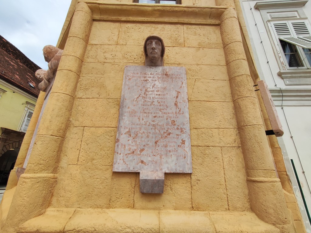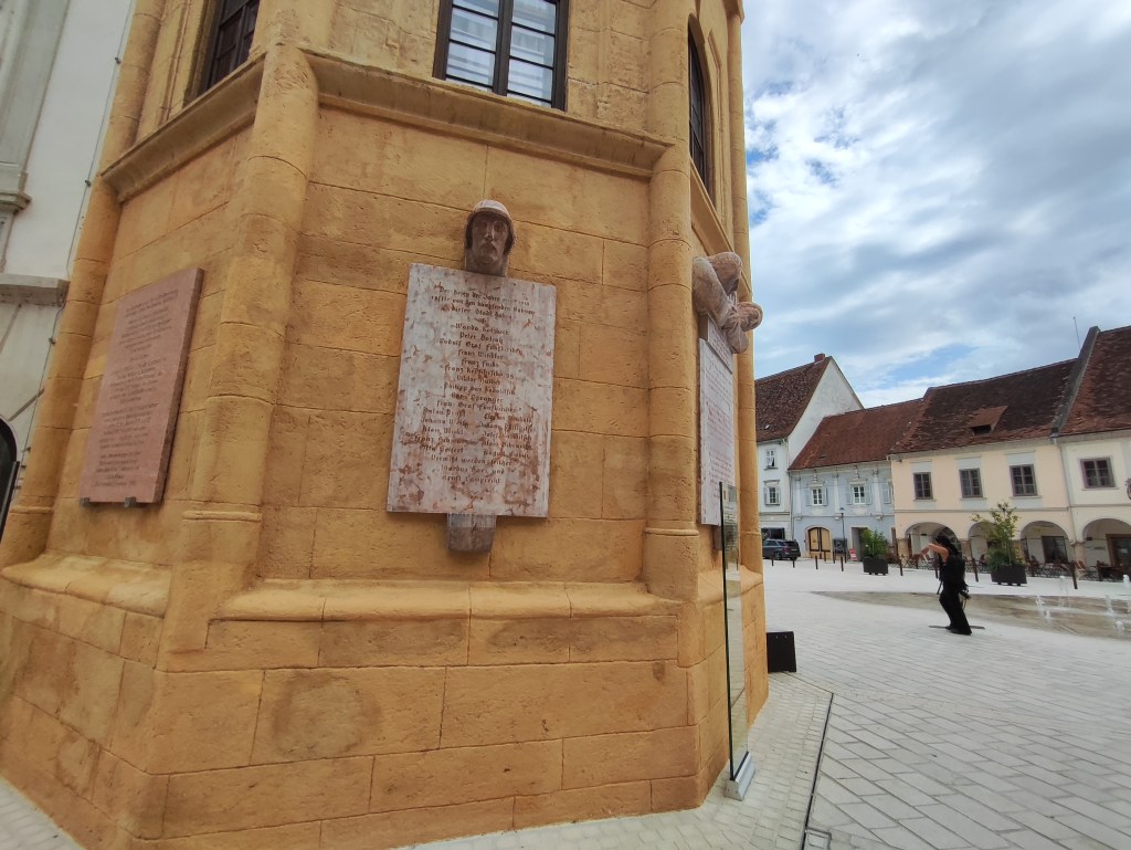Wir begeben uns zum Hauptplatz, wo der alte Rathausturm[3] mit seinen roten Marmortafeln, deren Inhalte teilweise umstritten sind, unser Ziel ist.