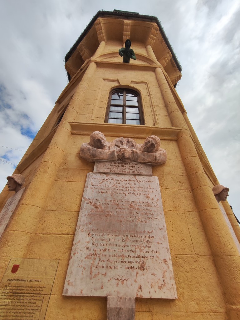 Auf der mittigen Texttafel ist unter dem Titel „An Krieg und Not soll dieses Mal erinnern, an Tat und Dulden um der Heimat Willen“ ein nationales Bekenntnis zum Deutschtum[5] zu lesen: