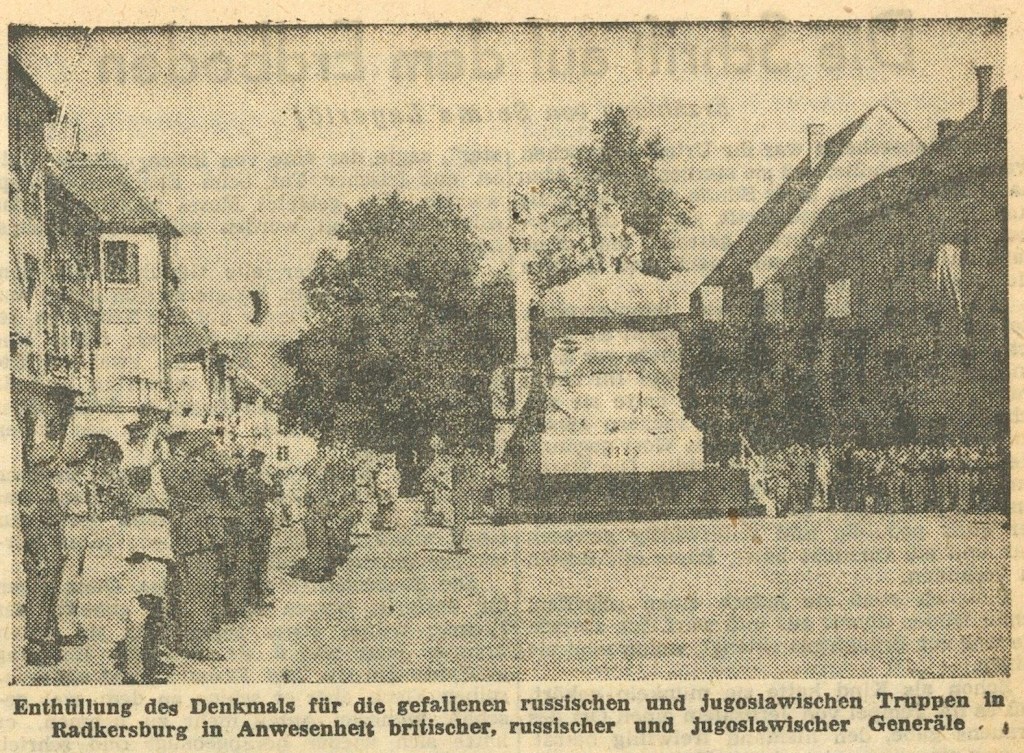 Die Enthüllung des damals noch um vieles wuchtigeren Denkmals am ursprünglichen prominenten Standort – dem Radkersburger Hauptplatz und in unmittelbarer Nähe zur Mariensäule – scheint erst am 12. August 1945 erfolgt zu sein, zusammen mit einer Denkmalenthüllung in Murska Sobota: „Sonntag fand die Enthüllung von zwei Denkmälern in Murska-Sabota (jenseits der jugoslawischen Grenze) und in Radkersburg (Österreich) statt. Die erste Gedenkfeier für die gefallenen russischen und jugoslawischen Truppen fand am Morgen, die zweite für die russischen Truppen am Nachmittag statt. In den Straßen von Murska-Sabota drängten sich die jugoslawischen Patrioten. Mädchen und Kinder in Nationalkostümen boten ein malerisches Bild, als sie die Autos der vertretenden Generäle mit Blumen bewarfen. Alle Gebäude waren mit russischen, jugoslawischen, amerikanischen und britischen Fahnen geschmückt. Das Denkmal ist ein eindrucksvoller Bau, überragt von zwei Soldaten in Bronze, einem russischen und einem jugoslawischen. Nach der Enthüllung hielten General Keselyov, der russische Vertreter in Belgrad, sowie die jugoslawischen Generäle Quander und Goschniak Ansprachen, in denen sie der Alliierten ehrend gedachten. Generalmajor C. E. Weir, der Kommandant der 43. britischen Division, drückte seine Hoffnung aus, dass die Gedenkfeier nicht vergeblich sein würde und dass die alliierten Mächte auch im Frieden weiter zusammenarbeiten würden. Einer Parade jugoslawischer Truppen folgte ein Vorbeimarsch von jugoslawischen Zivilbeamten. Nach einem Frühstück begaben sich die Generäle nach Radkersburg, das jetzt von britischen Truppen besetzt ist. Dort begrüßten britische Ehrenposten die Offiziere. Es wurde ein eindrucksvolles Denkmal aus Stein von General Strukov, dem russischen Kommandanten in Wien, enthüllt. Es folgten die russische, jugoslawische, amerikanische und britische Nationalhymne und Ansprachen jugoslawischen Generals Levitnich sowie Generalmajors Weir. Mit General Weir erschien Brigadier A. D. McKechnie, Kommandeur der 138. Brigade, und Oberst Wilkinson, Leiter der Militärregierung Steiermark. Bei der Nachmittagsfeier spielte die Kapelle der 138. Infanteriebrigade.“[3]