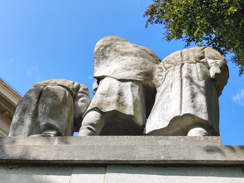 Nach wenigen Fahrminuten kommen wir, David Kranzelbinder folgend, am Grazertorplatz beim Siegesdenkmal der Roten Armee an, das in einer kleinen Grünfläche aufgestellt ist. Der mit Marmorplatten verkleidete Sockel zeigt drei vom Grazer Künstler Wilhelm Gösser entworfene Sowjetsoldaten in kämpfender marschierender, stehender und knieender Position, mit Maschinenpistolen (teilweise im Anschlag) und einer Flagge mit dem Sowjetstern.