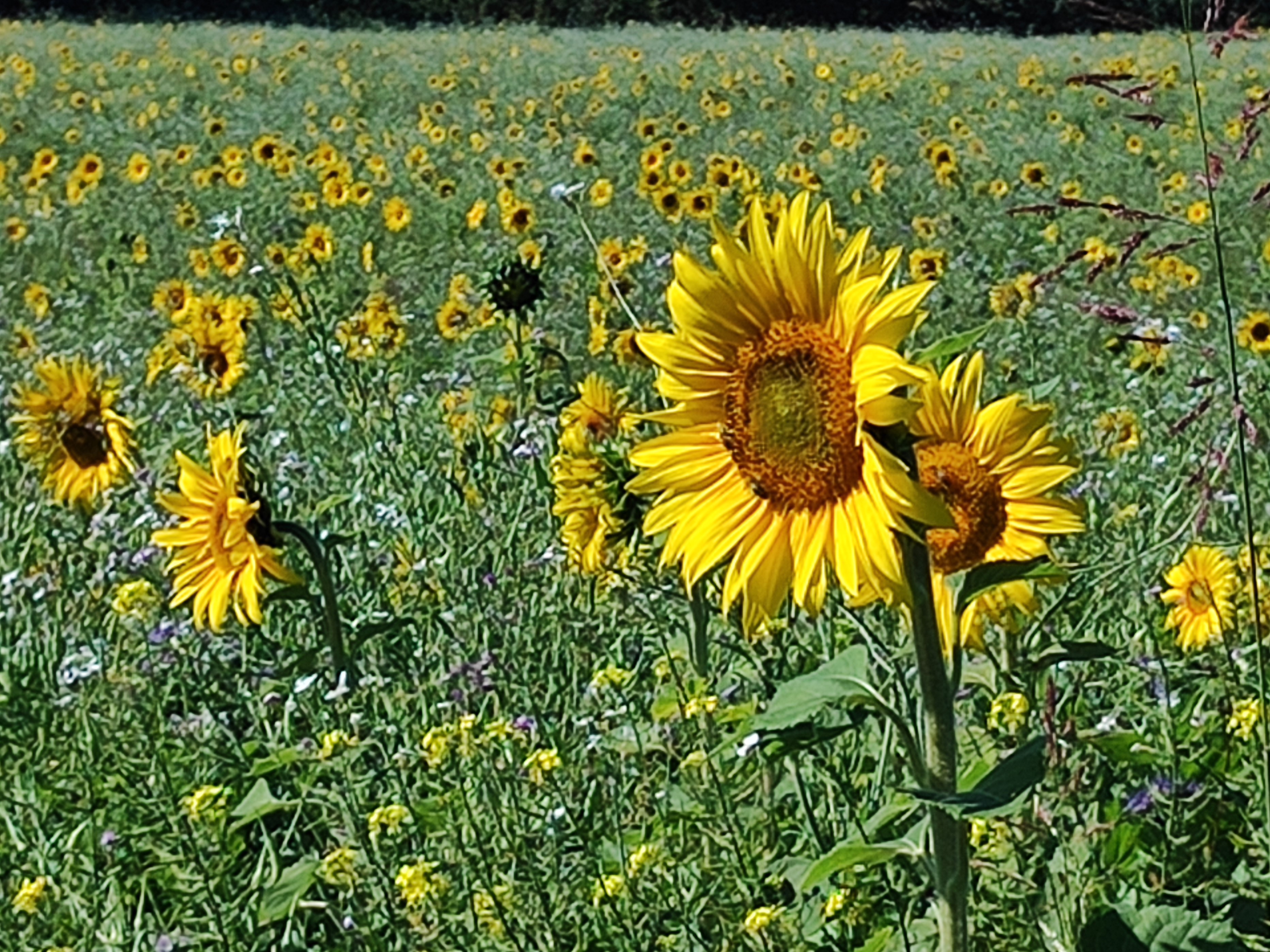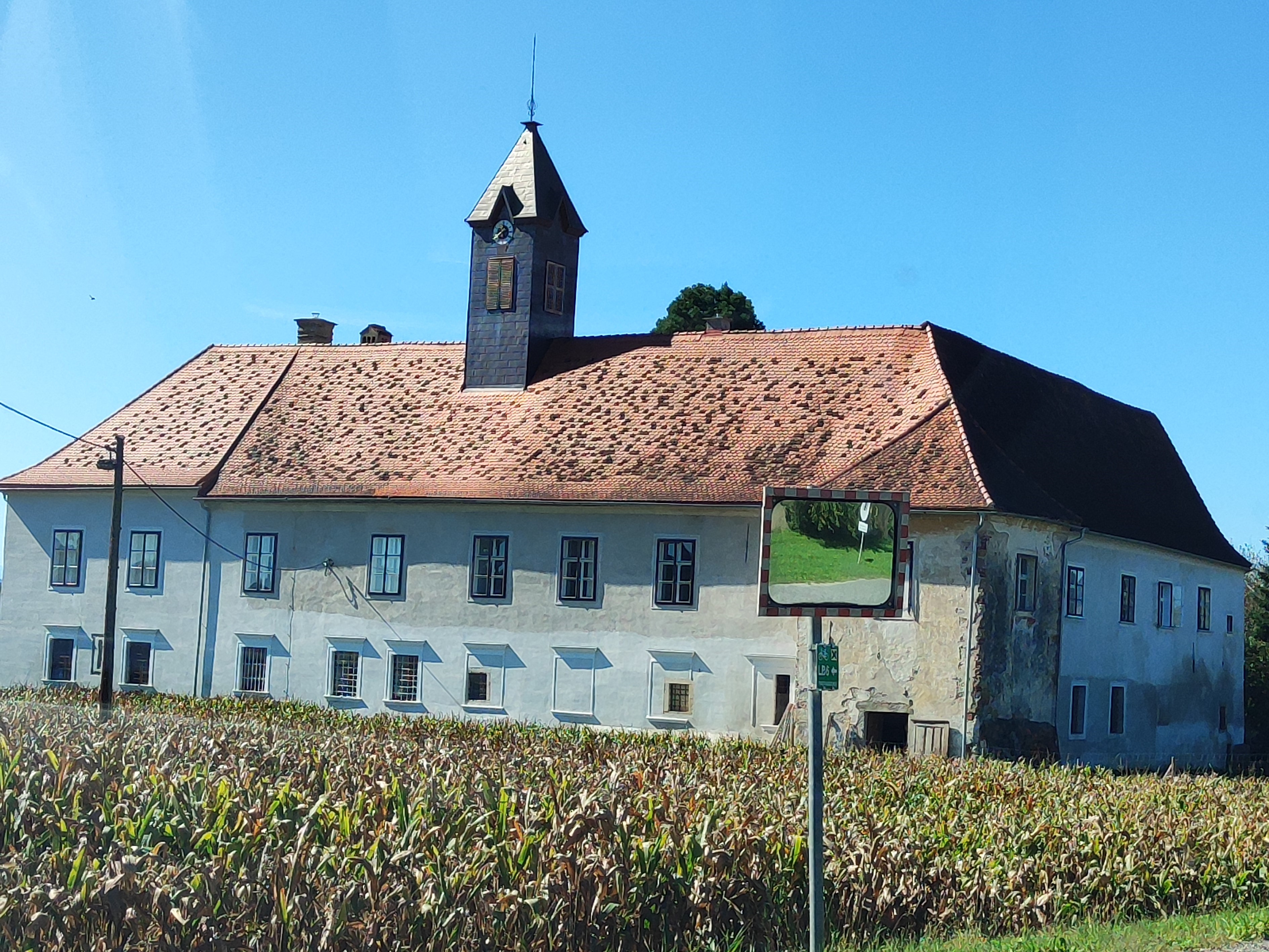Von dort gilt es noch die Autobahn zu unterqueren. Dann, im Gewerbegebiet folgen wir dem schmalen Feldweg entlang dem Sonnenblumenfeld und kommen beim ehemaligen Militärfriedhof des Militär- und Gefangenenlagers Lang-Lebring an, das im Zusammenhang steht mit dem im Frühjahr 1915 errichteten Kriegsgefangenlager Lebring.