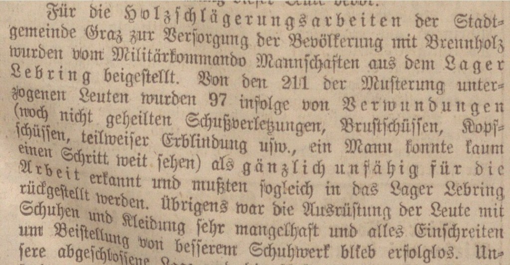 Wie schlecht der Gesundheitszustand vieler im Lager 1918 war, beschreibt auch eine Diskussion im Grazer Gemeinderat. Von 211 „Militärarbeitern“, die von Lebring nach Graz zu Holzschlägerungsarbeiten beigestellt wurden, waren 97 infolge von Verwundungen völlig arbeitsunfähig. [8]