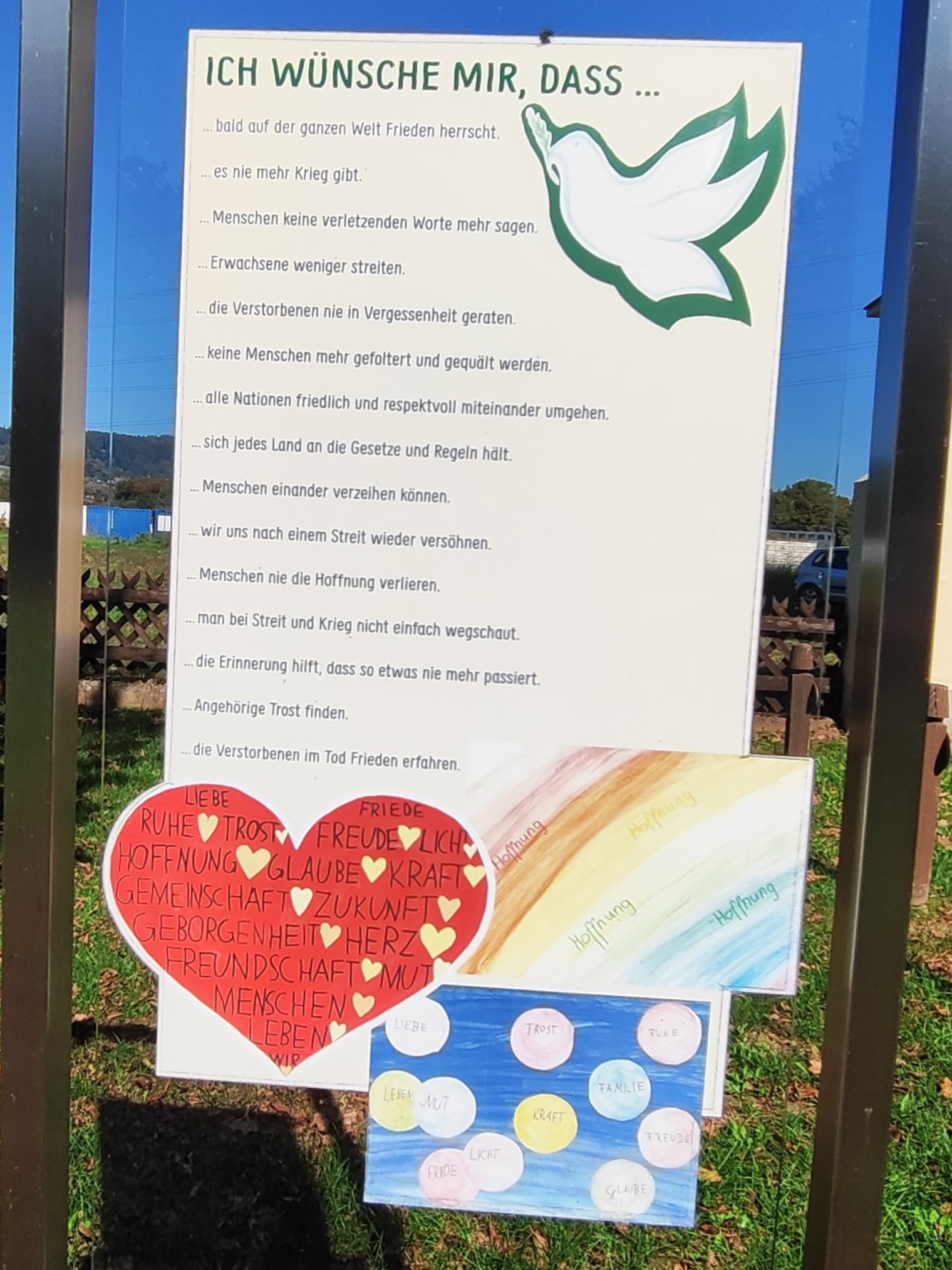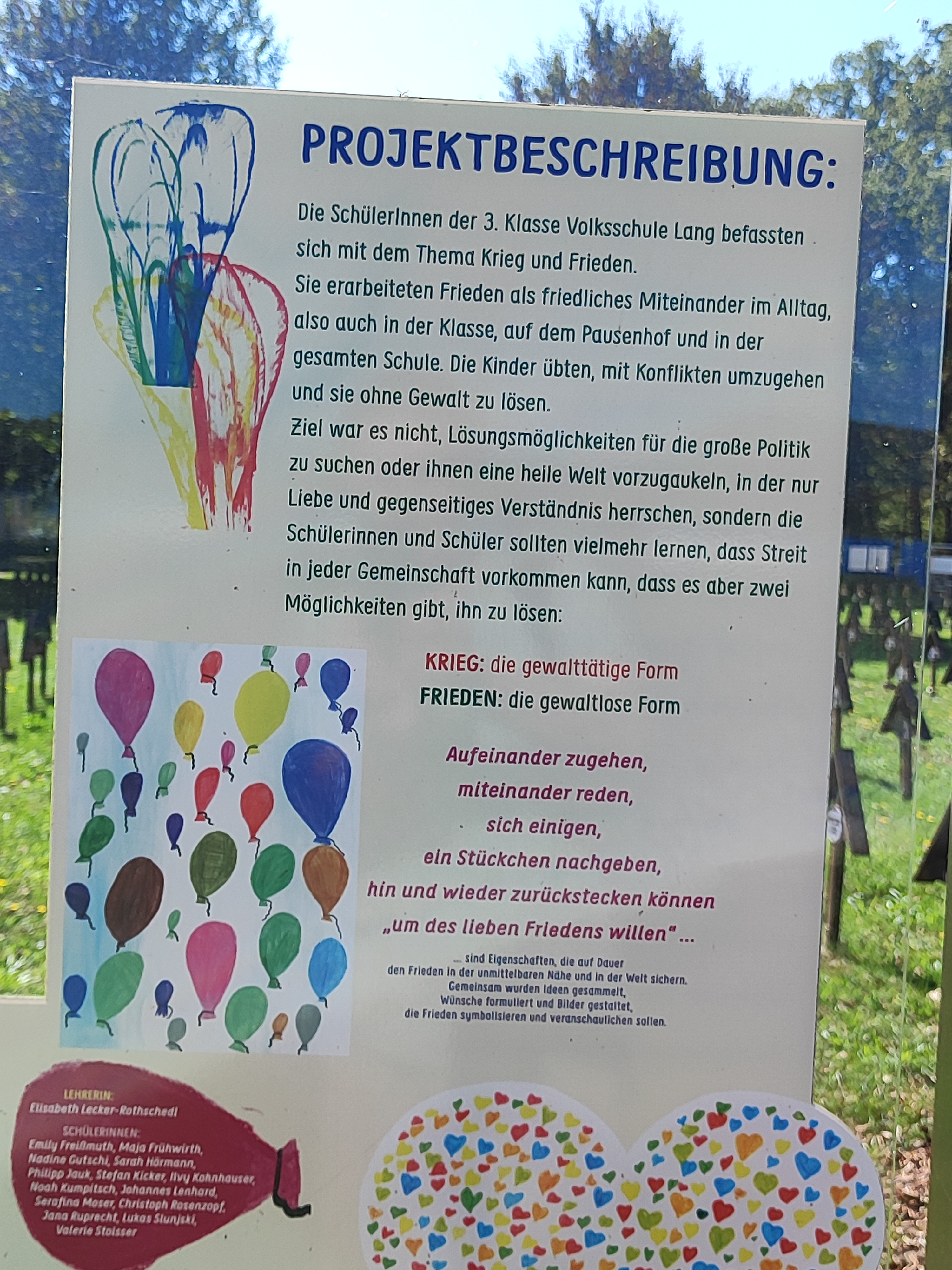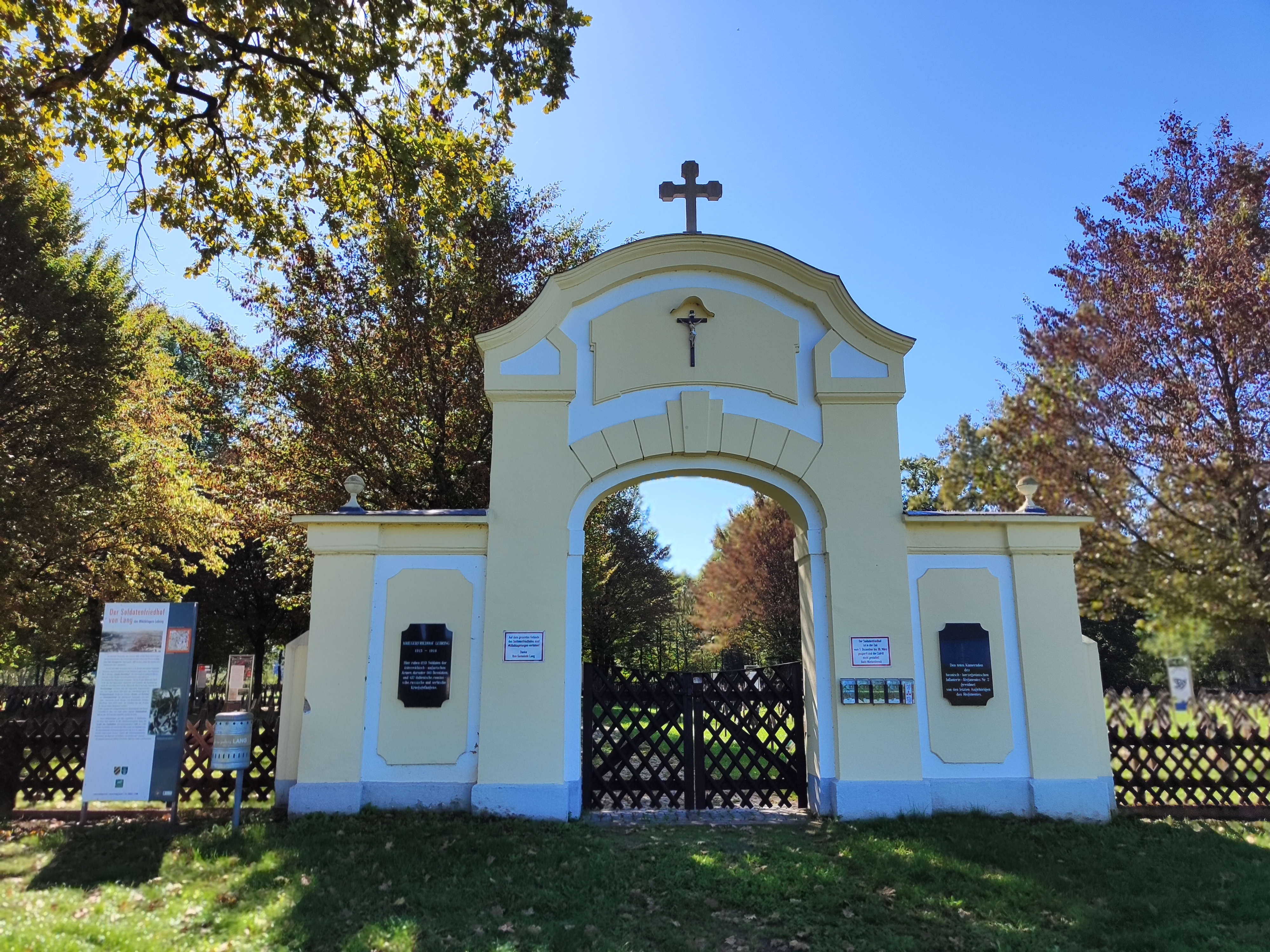 Auf den ersten Blick etwas irritierend wirken die zehn im Gedenkjahr 2014 umgesetzten Metallrahmen, die nach einer Idee von Joachim Schnabel, dem Bürgermeister der Gemeinde Lang, unter Leitung des Kulturpark Hengist und der Einbeziehung von Schüler:innen am Friedhof aufgestellt sind, teilweise auch mitten in den Gräberreihen. Doch genau diese Irritation ist eine der Intentionen des Projektes „Erinnerungsrahmen“, wie ein Rahmen erklärt: „Durch die unregelmäßige Platzierung am Friedhof entstehen Akzente in der einheitlich gestalteten Rasenfläche.“ Auf anderen Rahmen finden sich Zitate, so wie auch bei unserem Projekt, individuelle Kriegserinnerungen aus Feldpostbriefen sowie Gedanken von Volksschüler:innen aus Lang zum Thema Krieg und Frieden. „Der zehnte Erinnerungsrahmen ist ‚leer‘. Er ist eine Symbol für eine uns noch nicht bekannte Zukunft und gleichzeitig eine Botschaft für den Frieden: Diese Geschichte darf sich nicht wiederholen (…)“.