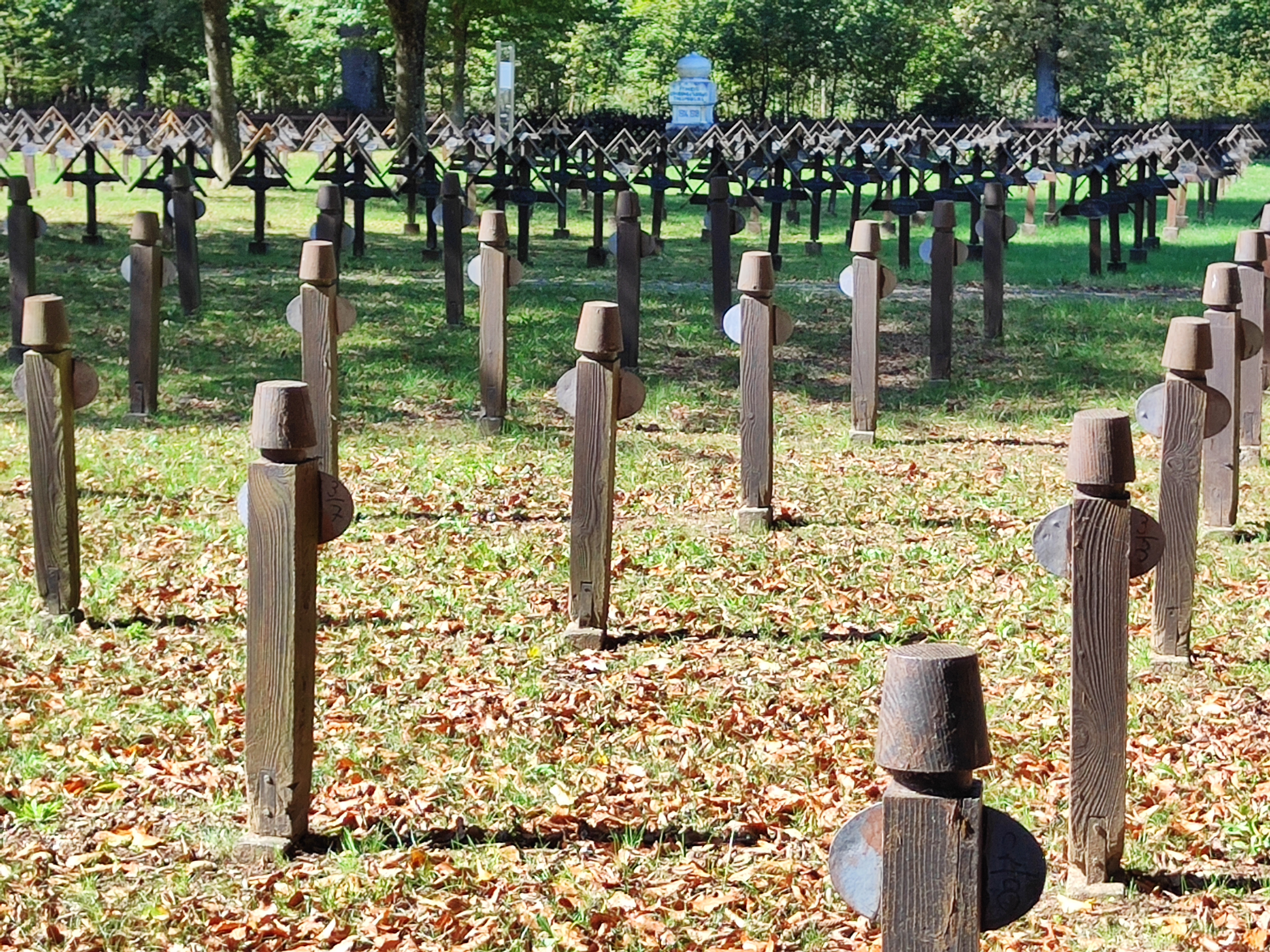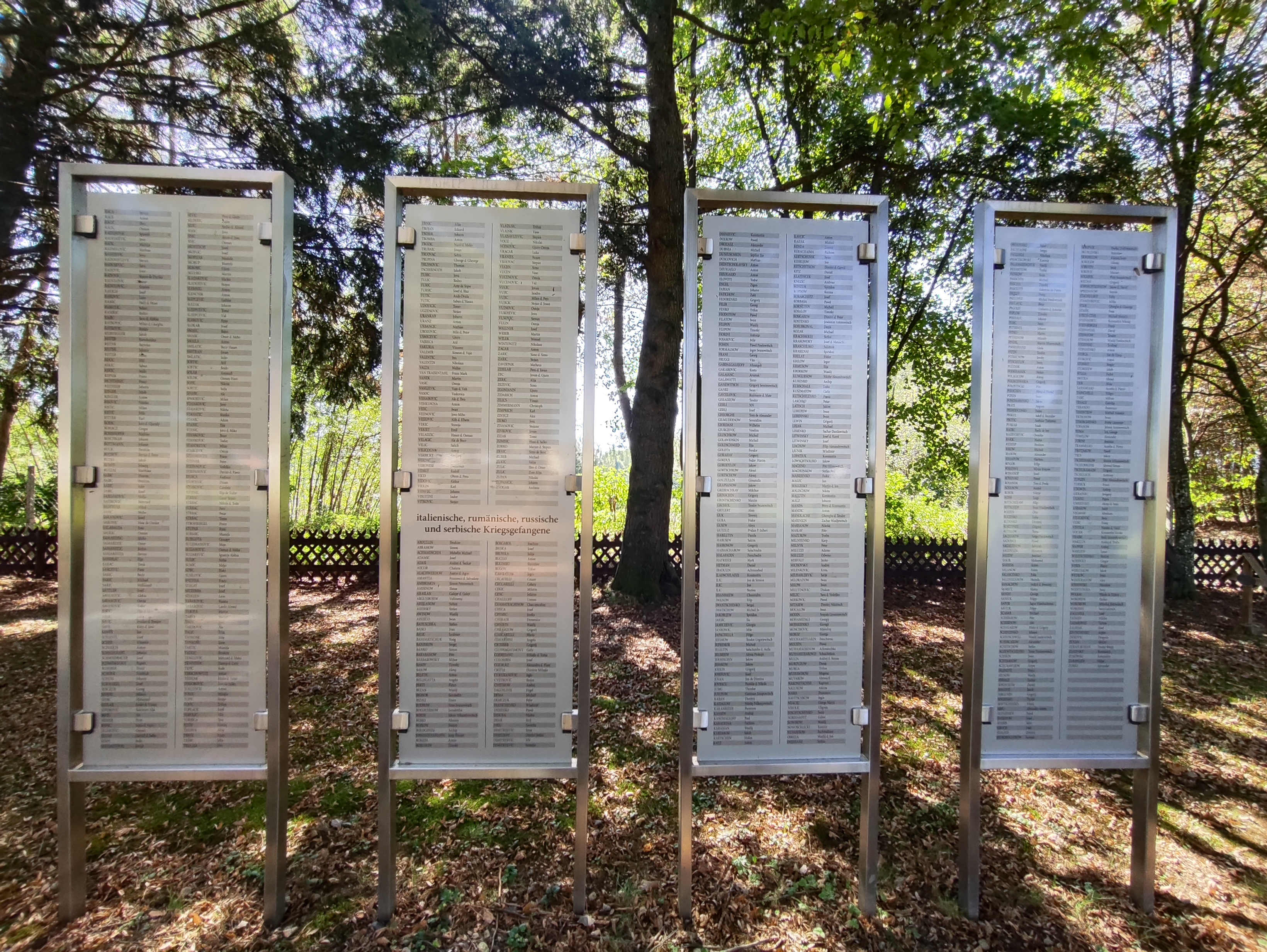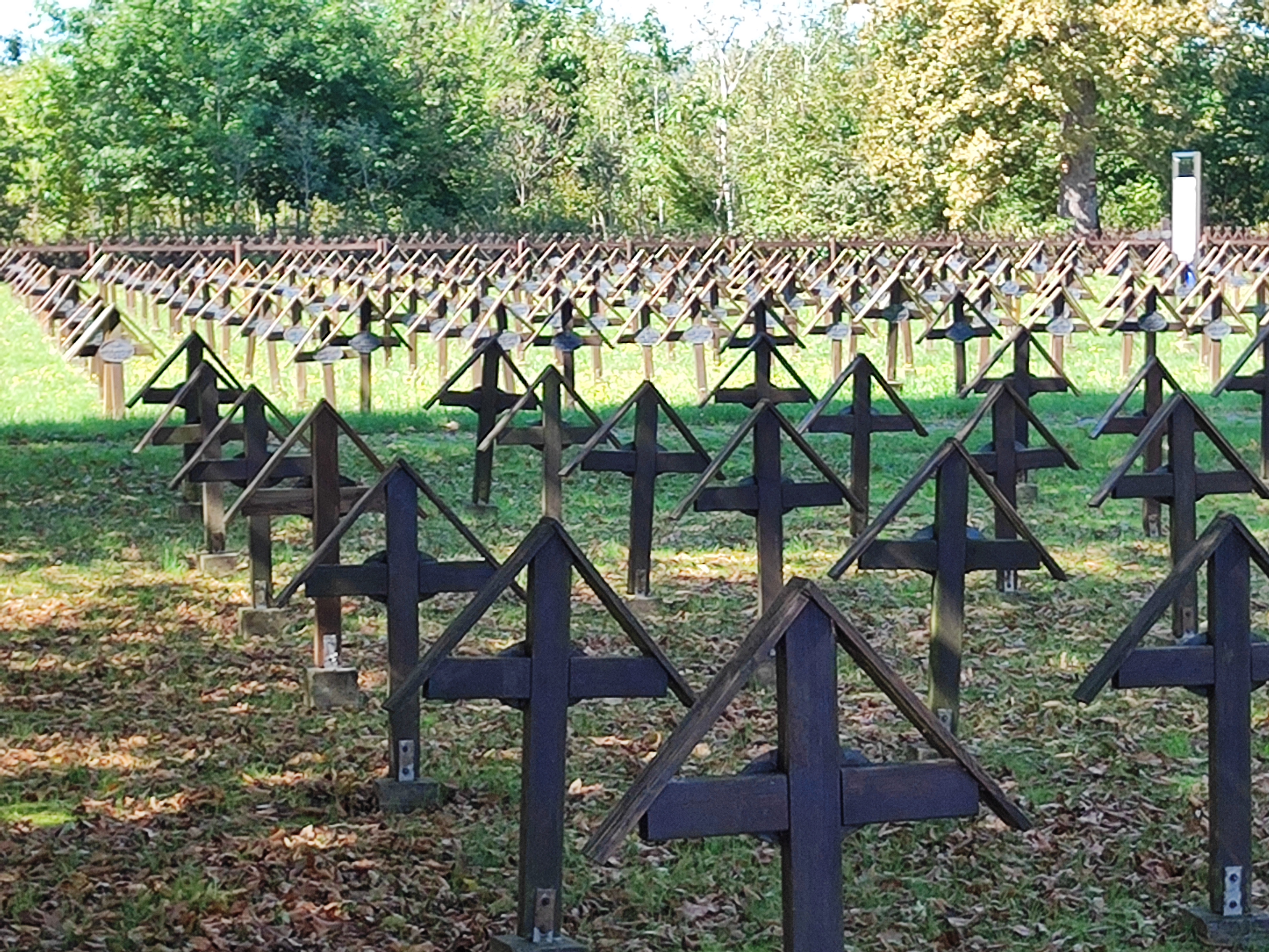 Es ist ruhig, in diesem abgelegen am Waldrand befindliche Friedhof mit diesen vielen, sorgfältig in geordneten Reihen angelegten Grabstätten und den Namen darauf. Ein großes Steinkreuz am Ende des Friedhofs wird umrahmt von acht Tafeln mit den Namen der toten Soldaten und Kriegsgefangenen.