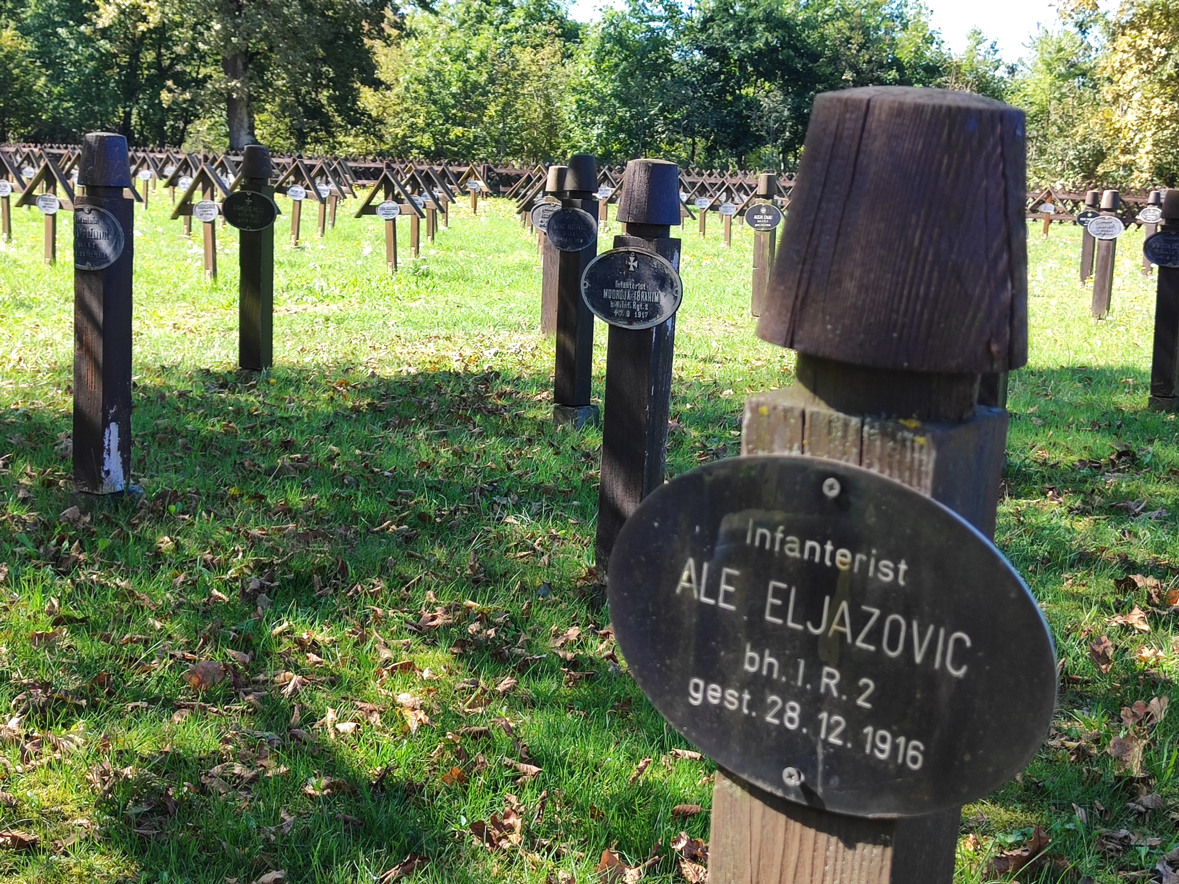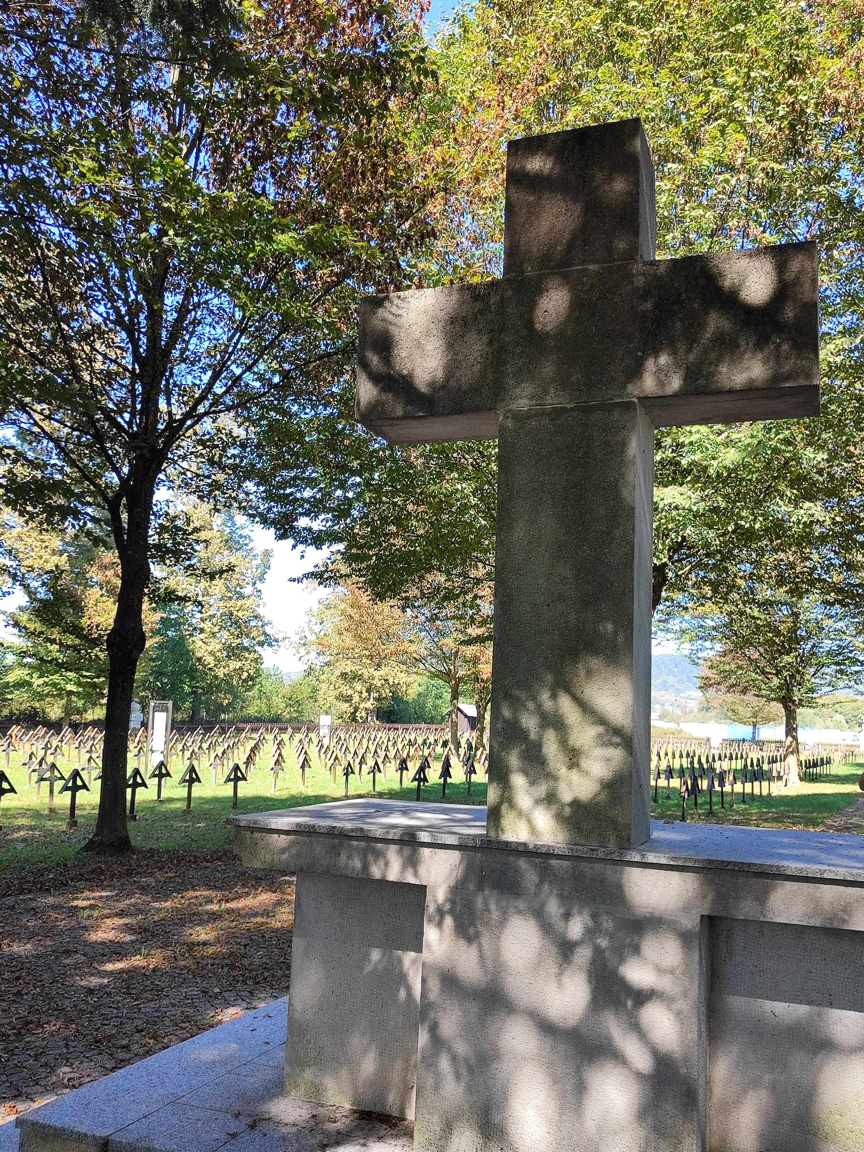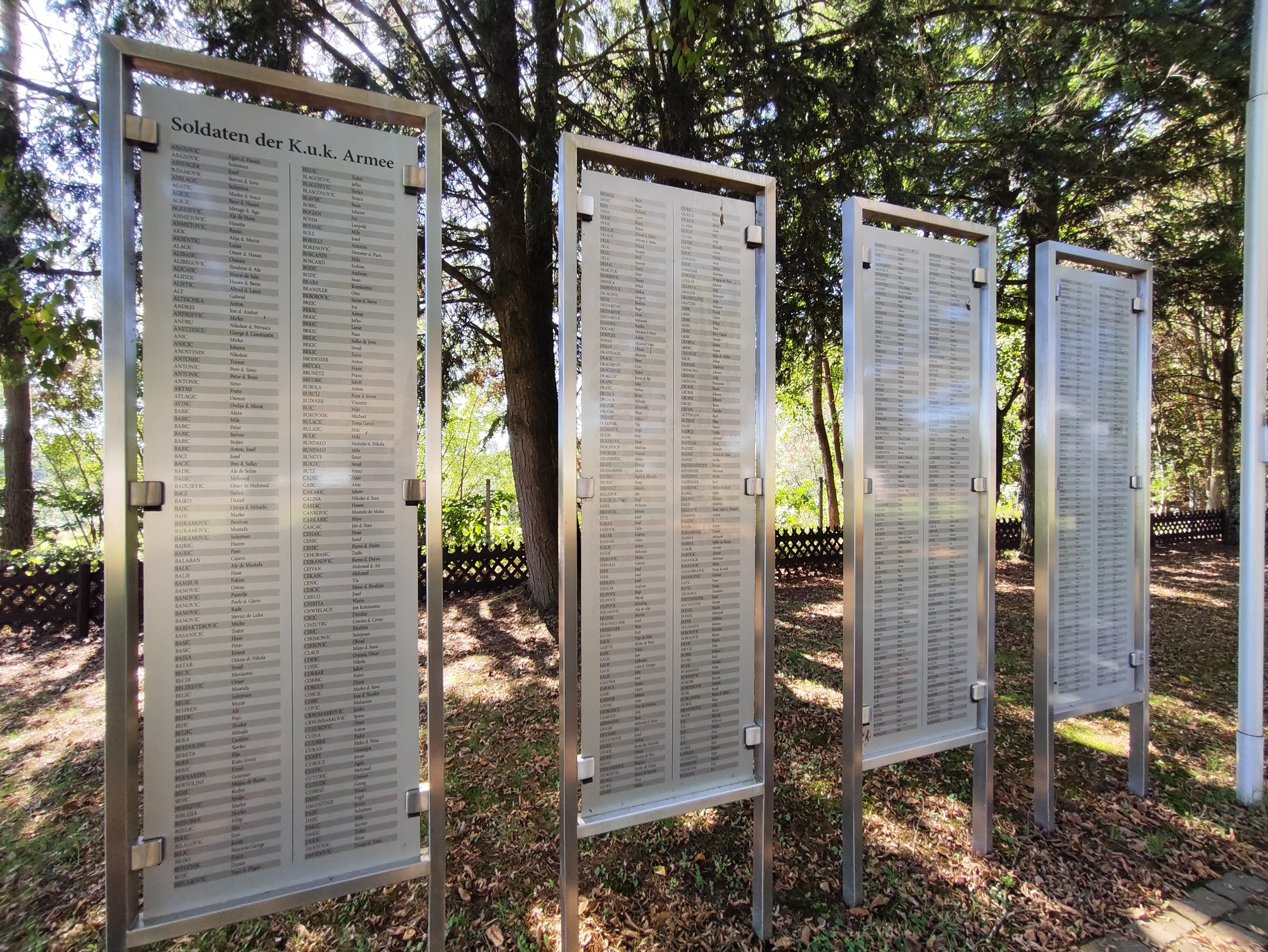 Es ist ruhig, in diesem abgelegen am Waldrand befindliche Friedhof mit diesen vielen, sorgfältig in geordneten Reihen angelegten Grabstätten und den Namen darauf. Ein großes Steinkreuz am Ende des Friedhofs wird umrahmt von acht Tafeln mit den Namen der toten Soldaten und Kriegsgefangenen.