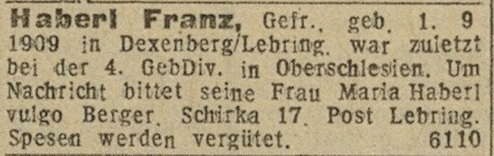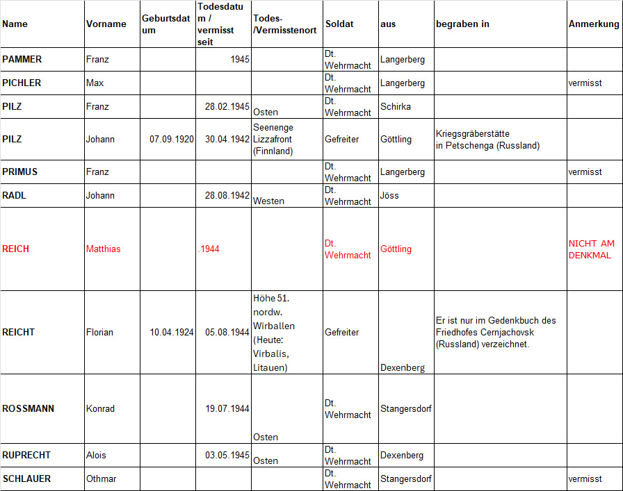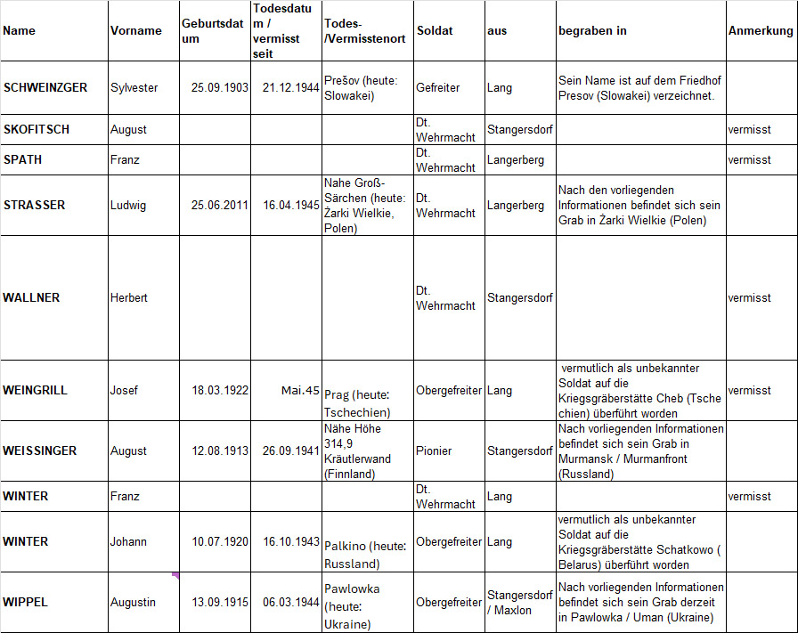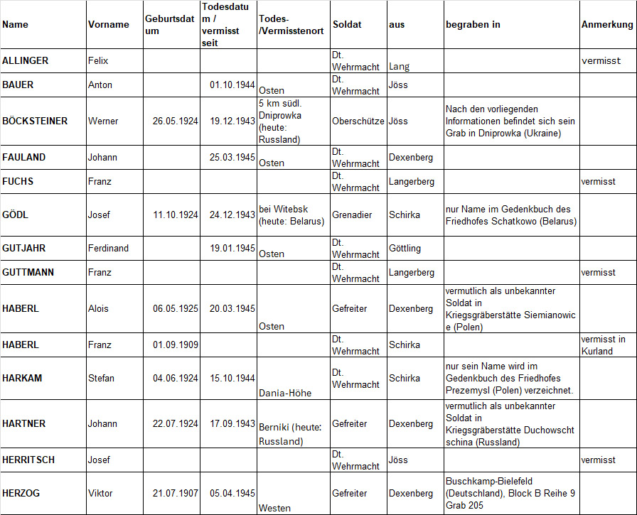 Wie bereits erwähnt, ist das Schicksal nicht weniger Soldaten auch aus der Gemeinde Lang ungeklärt. Sie gelten als „vermisst“, ohne Todesdatum, Todesort oder bekannte Grabstelle. Ludwig Strasser wurde noch im Juni 1946 und Franz Haberl gar im März 1948 vergeblich von ihren Familien gesucht. Beide Namen stehen unter den Toten am Denkmal.