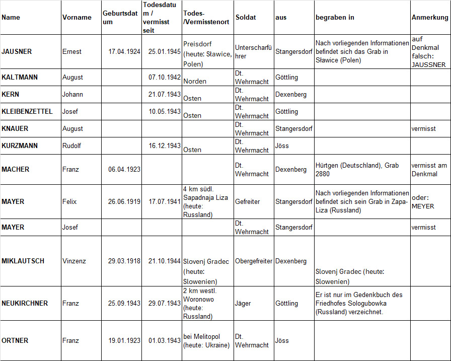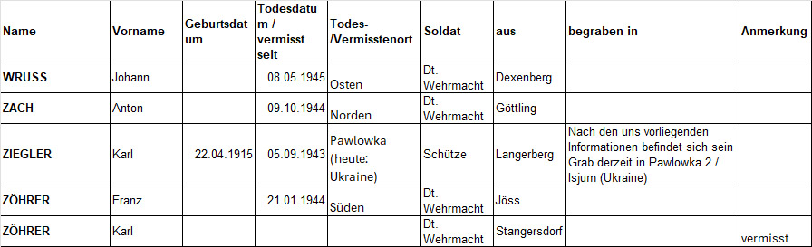 Auf der Basis der Daten des Denkmals konnten über die Gräbersuche auf der Seite des Deutschen Volksbunds[10] noch teilweise Geburtsdaten, genauere Sterbeorte und Grabstellen eruiert werden: