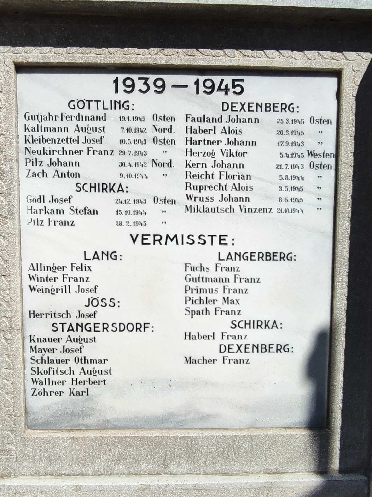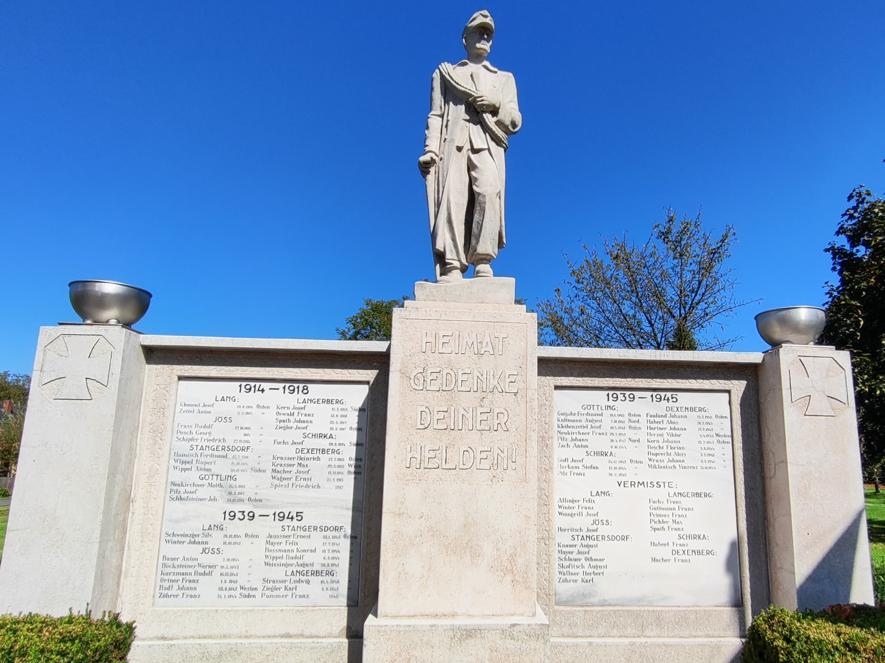 Die Gemeinde Lang mit heute rund 1400 Einwohner:innen[2] besteht aus den Ortschaften Dexenberg, Göttling, Jöß, Lang, Langaberg (Langerberg), Schirka und Stangersdorf und nach diesen Orten sind auch die 21 Gefallenen des Ersten Weltkriegs und 34 Gefallenen und 17 Vermissten des Zweiten Weltkriegs am Denkmal angeordnet.