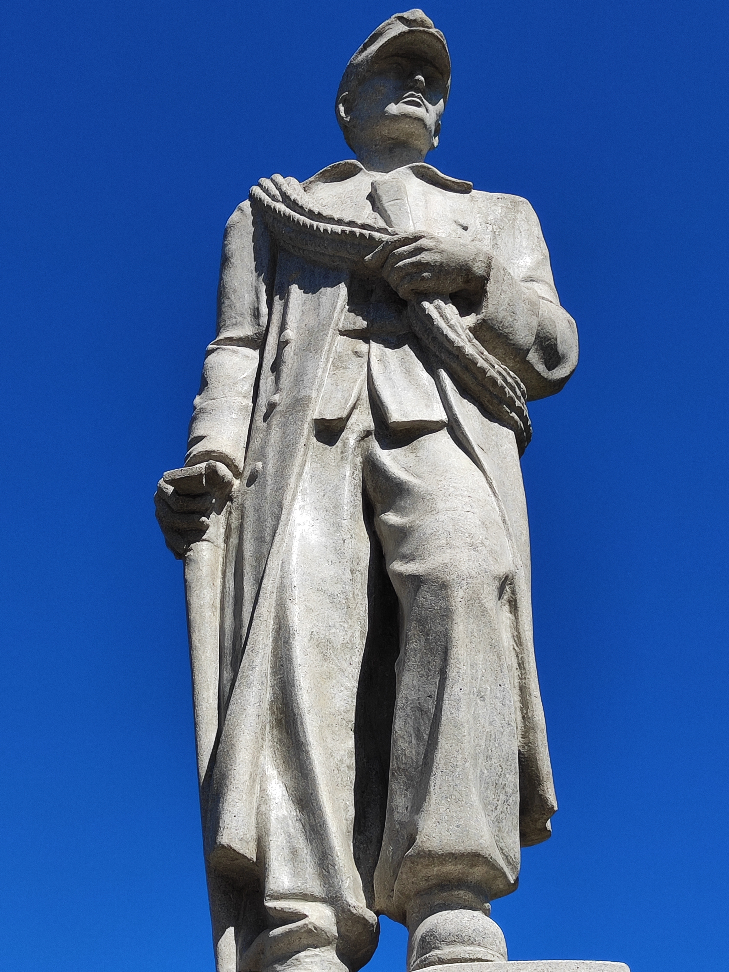 Vor dem im Juli 1951 gesegneten Kriegerdenkmal angekommen, fällt uns als erstes die Gestaltung der vom Grazer Bildhauer Max Prüger geschaffenen Statue eines Gebirgsjägers ins Auge. Stehend auf einem erhöhten Sockel, hält die eine Hand das umgehängte Seil, die andere ist leicht gestützt auf seinen Pickel. Er erscheint unbewaffnet.