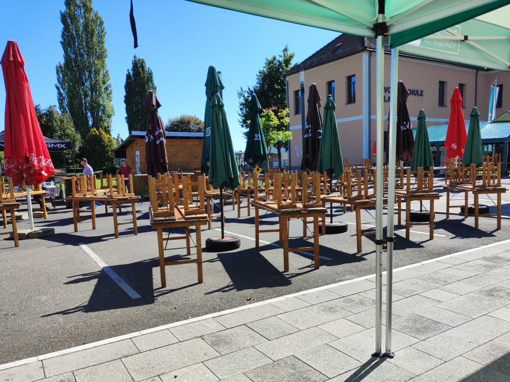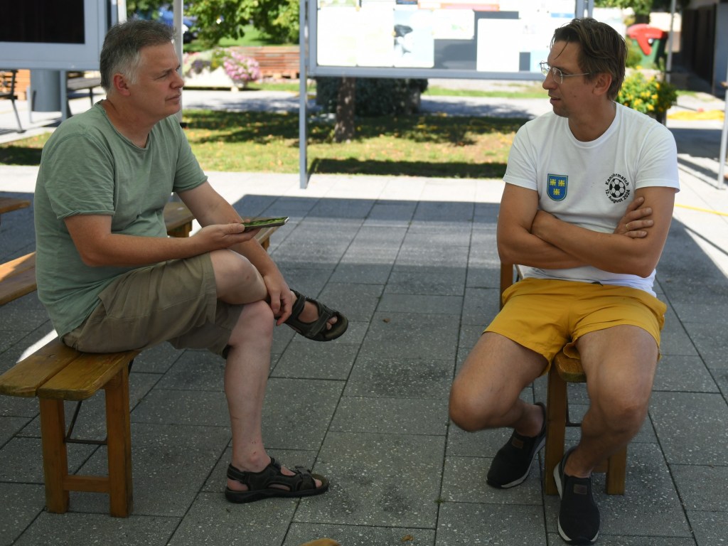 So wie in anderen Orten auch, erregt unser Fotoshooting das Interesse der Bevölkerung. Vom nahen, in Vorbereitung befindlichen Festplatz gesellt sich ein interessierter Herr im T-Shirt zu uns. Unser Tun erklärend, meint er, der sich zu unserer großen Überraschung als Bürgermeister und ÖVP-Parlamentarier Joachim Schnabel[1] entpuppt, dass auch er mit dem Wort „Helden“ am Denkmal wenig anfangen könne. Nach unserem Fotoshooting nimmt sich Joachim, mit dem wir gleich Per-Du sein dürfen, Zeit für ein Gespräch.