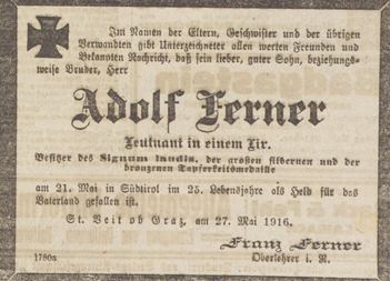 - Mit Kriegsbeginn freiwillig eingerückt war der in St. Andrä geborene und zuletzt als Volksschullehrer in Marburg (heute: Maribor, Slowenien) angestellte Lehrer „Adolf Ferner, Sohn des Oberlehrers Ferner in St. Veit ob Graz.“ Der Reserveleutnant wurde „für sein so tapferes Verhalten vor dem Feinde mit der großen Silbernen und der Bronzenen Tapferkeitsmedaille und vor kurzem auch mit dem Signum Laudis ausgezeichnet.“[8] Er starb in Südtirol, „als tapferer Held gegen die treulosen Italiener“[9], wie es in den Taufmatrikeln der Pfarre St. Andrä festgehalten wurde am 21. Mai 1916, heroisiert als Held: „Es war am 21. Mai […], als wir im Vorrücken gegen Abend auf eine stark befestigte Stellung der Welschen stießen, die aber unter jeder Bedingung genommen werden musste. Das ganze Regiment ging zum Sturme vor, die […] Kompagnie, an der Spitze Leutnant Ferner, als linke Flügelkompagnie. Gegen 9 Uhr abends wurde unter fürchterlichem Maschinengewehrfeuer die Stellung am Campo Manderiolo genommen. Leider ließ dabei so mancher Edle sein Leben, als einer der ersten, in den feindlichen Schützengraben eindringend, Kompagniekommandant Leutnant Ferner, tiefbetrauert vom ganzen Regiment. Nun ruht der junge Held, […] am Fuße des Cima de Vezenna […]“.[10] , [11]