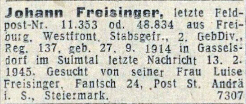 - Schon im März 1945 war Johann Freisinger verstorben, auf dessen Rückkehr seine Frau noch ein Jahr später vergeblich hoffte.[18]