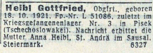 - In ukrainischer Kriegsgefangenschaft verstarb im März 1946 Gottfried Heibl. Im Mai 1946 schaltete seine Mutter noch eine Suchanzeige in der Zeitung.[15]