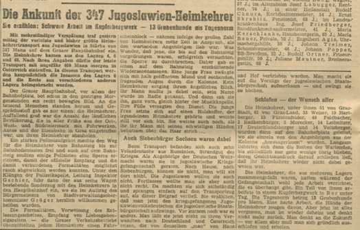 - Mit dem bis dahin größten Transport von Kriegsgefangenen aus Jugoslawien kam im Jänner 1949 auch Friedrich Aldrian aus Höch nach Graz zurück, wo die Heimkehrer von bis zu 1.000 Menschen erwartet wurden.[19]