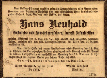 - Der 21-jährige Landsturm-Infanterist Hans Neuhold, Sohn der Gastwirtin Marie Neuhold verstarb am 9. Mai 1917 im Grazer Barmherzigenspital nach längerem Leiden an einer Nierenentzündung und wurde in St. Andrä begraben.[7]