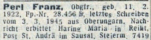 - Ebenfalls 1946 galt Franz Perl als vermisst, der dann jedoch zurückgekommen war.[17]