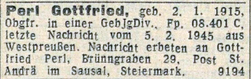 - Im Jahr 1946 wurde noch nach Gottfried Perl gesucht, der jedoch bereits 1945 verstorben war.[16]