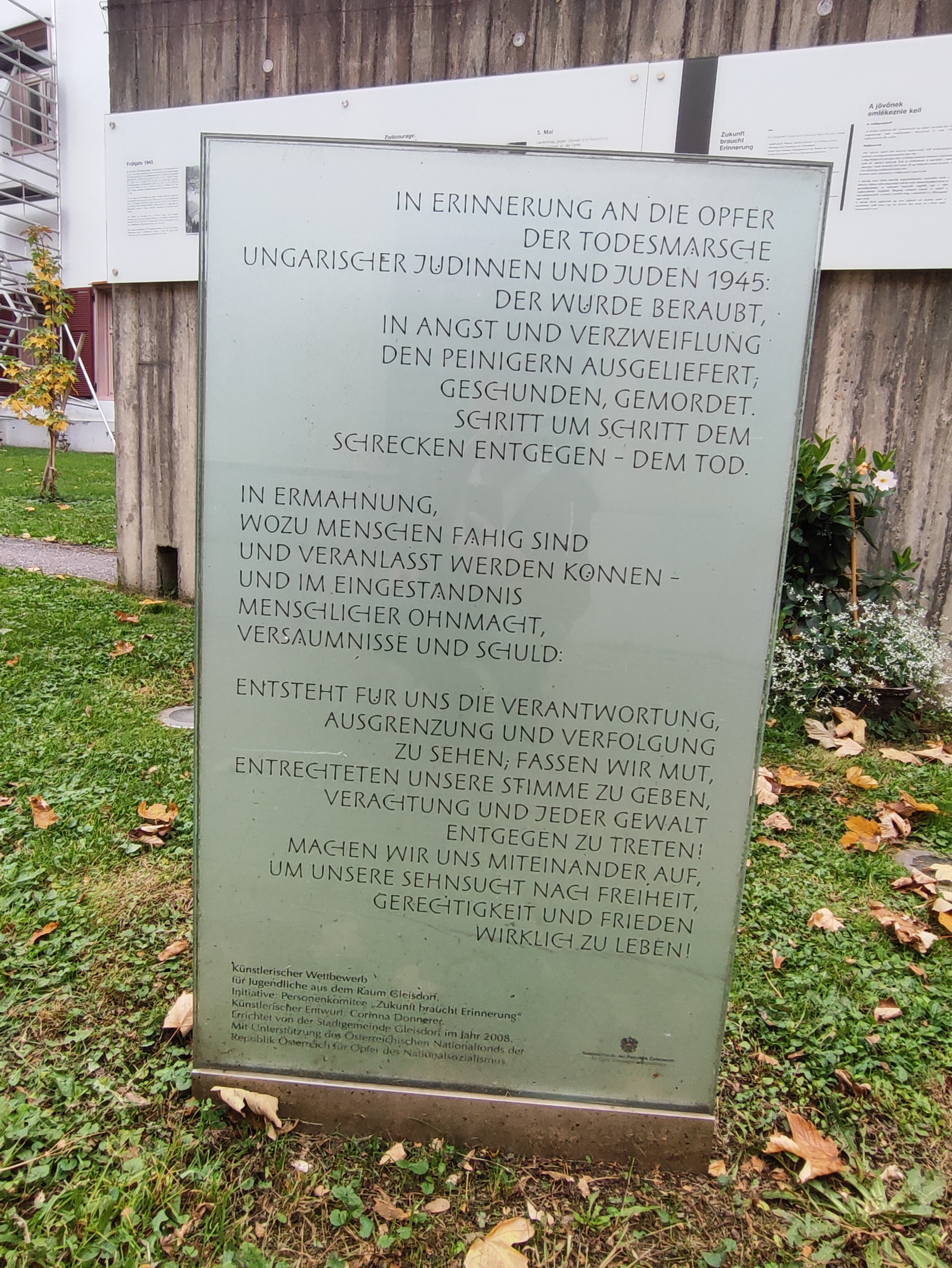 Im Jahr 2014 wurde, so Wolfgang, vom Geschichtslehrer Peter Gerstmann in der damaligen Nachbargemeinde Nitscha der erste Preis des Gleisdorfer Gestaltungswettbewerbs – ein Entwurf von Sabine Mahr, einer Jugendlichen aus Nitscha – umgesetzt.[4] Durch die Eingemeindung von Nitscha hat Gleisdorf nunmehr sogar zwei Mahnmale.