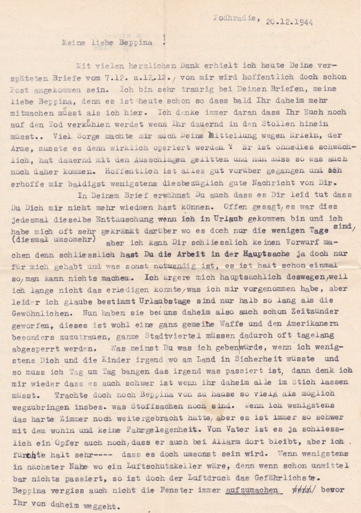 Aufgrund der vorrückenden Front wurde er im November 1944 in das slowakische Podhradie verlegt. Da er in Belgien und auch in der Slowakei in der Schreibstube tätig war, sind viele seiner Briefe mit der Schreibmaschine geschrieben. In vielen Briefen äußert er seine Sorge um seine Familie in Graz, der er vergeblich rät, die Stadt zu verlassen. Und tatsächlich wird das Haus der Familie in Graz durch Bomben schwer geschädigt. Als sein älterer Sohn auch noch nach Radkersburg kommt, und dort bei den Abwehrarbeiten eingesetzt wird, ist er krank vor Sorge.