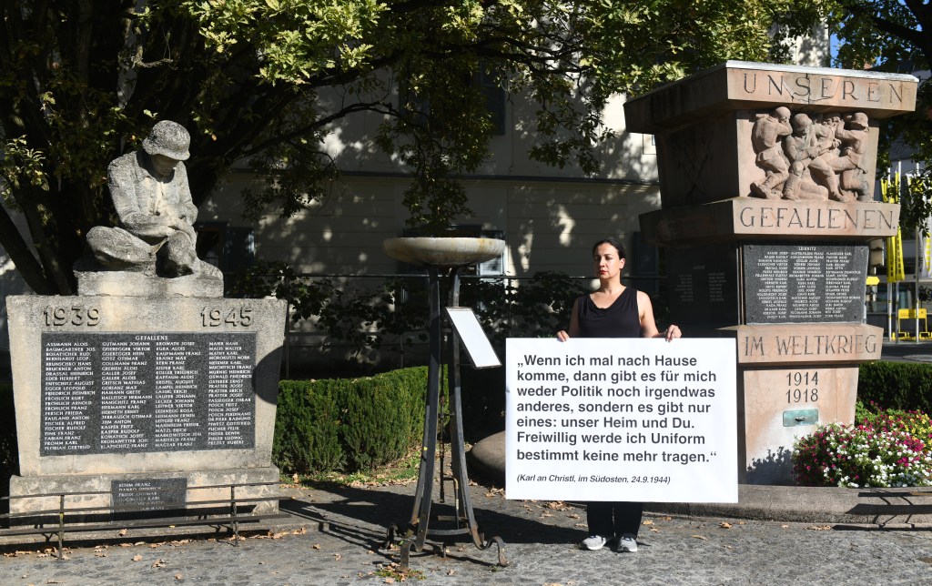 Im Rahmen unseres Projekts führen wir fotokünstlerische Interventionen bei den Denkmälern durch. Maryam Mohammadi, die als kleines Kind selbst einen mehrjährigen Krieg erlebt hat, hält dabei Zitate aus Feldpostbriefen.